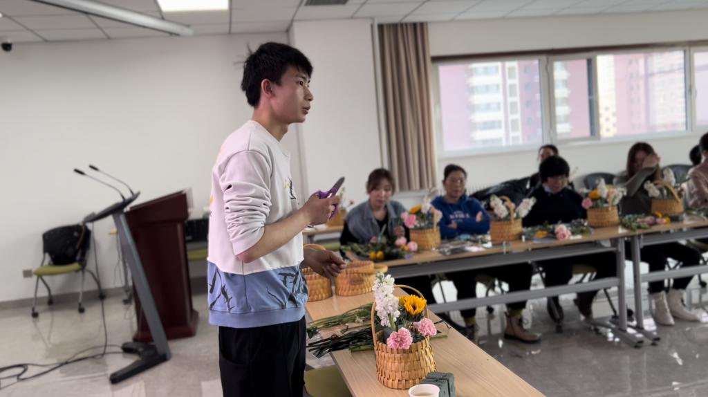 活动邀请资深花艺师为大家讲解各类常见花卉的花语及插花的基本技法,并提供材料,现场指导老师们进行了花篮花艺的搭建。在花艺师的指导下,老师们将花材修剪、整枝、排列、用心搭配,成功创作出属于自己的插花作品。