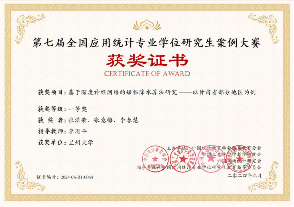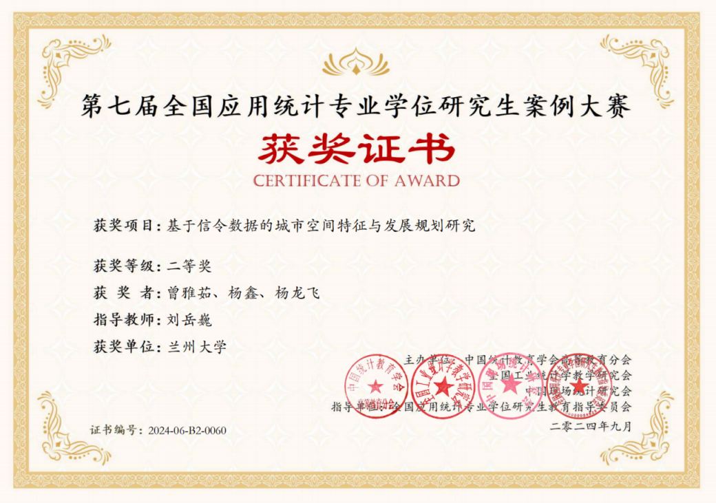 beat365官网李周平教授指导的研究生团队张浩荣、张艺梅、李春慧,作品《基于深度神经网络的短临降水算法研究——以甘肃省部分地区为例》和刘岳巍教授指导的研究生团队曾雅茹、杨鑫、杨龙飞,作品《基于信令数据的城市空间特征与发展规划研究》代表我校参加全国总决赛,分别荣获大赛全国一等奖、全国二等奖,并全部入选优秀案例库。