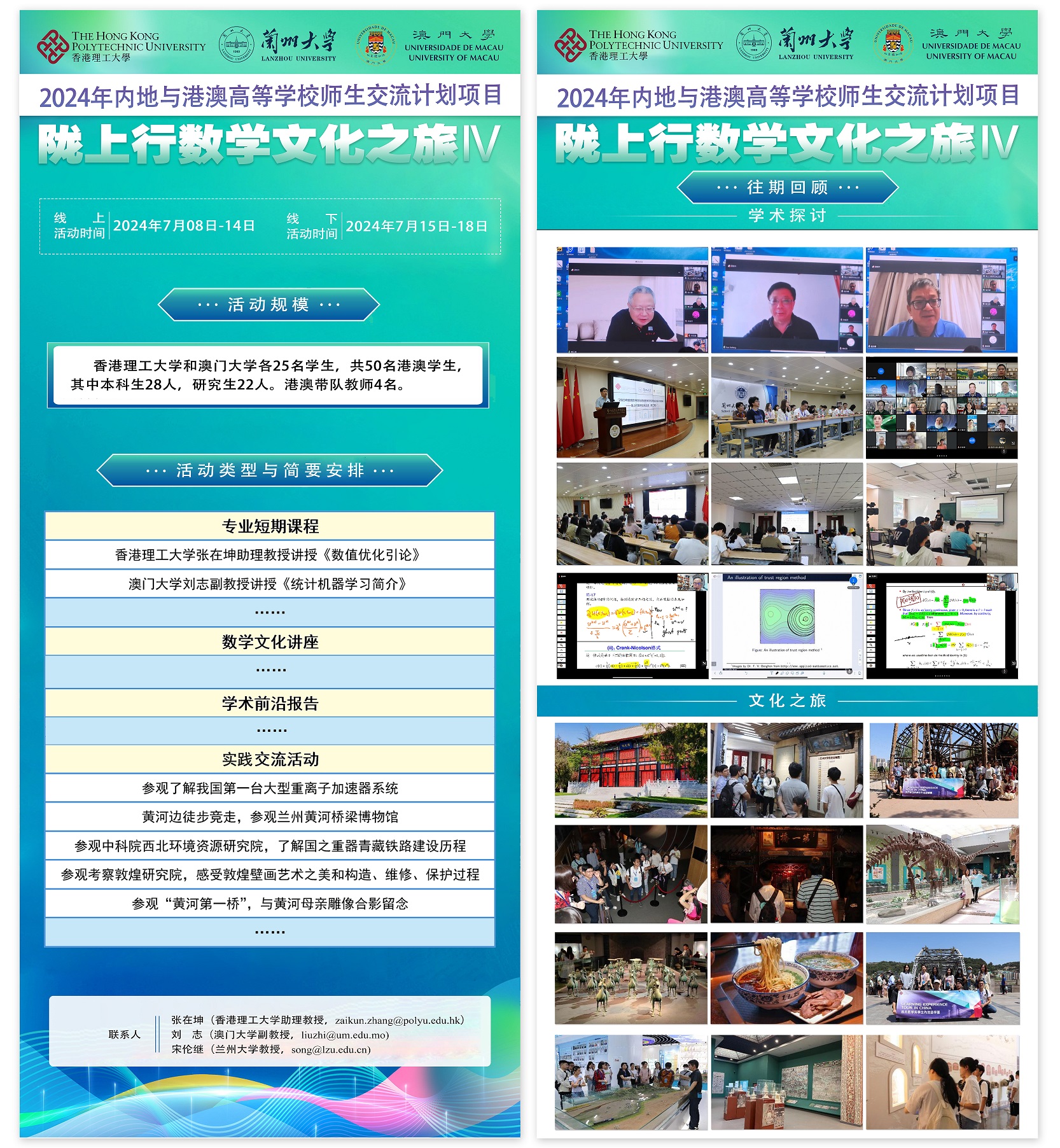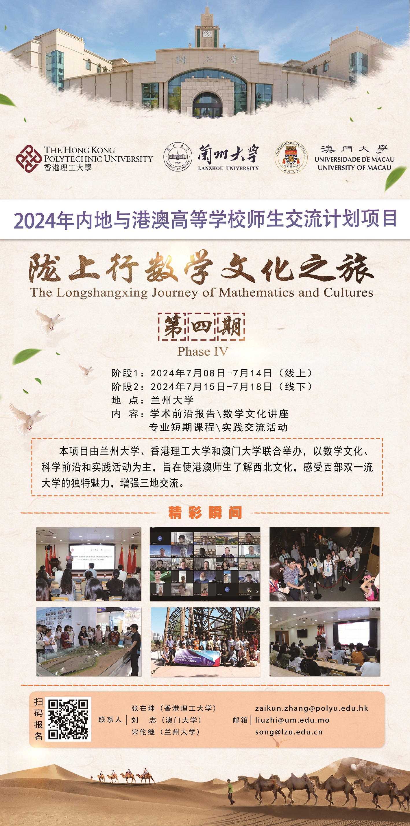 (3)教育部港澳与内地高校交流项目:“2024年内地与港澳高等学校师生交流计划项目——陇上行数学文化之旅(第四期)”于7月8日至18日在beat365正版唯一举行。本项活动受教育部近年连续资助,由best365在线官网登录入口承办,联合香港理工大学、澳门大学师生,通过专业短期课程、前沿讲座报告、实践交流活动等形式,交流探讨学科前沿进展与应用,促进两地学子探究学科问题、学习科研方法,产生文化共鸣,增强文化自信,提升自身能力和专业知识。
