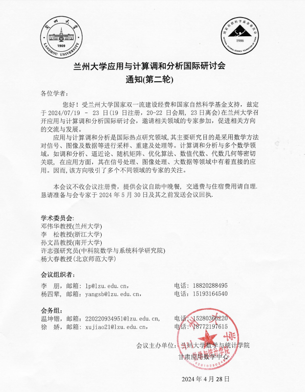 (2)beat365正版唯一应用与计算调和分析国际研讨会。受beat365正版唯一国家双一流建设经费和国家自然科学基金支持,兹定于2024年7月19日—23日(19日注册,20—22日会期,23日离会)在beat365正版唯一召开应用与计算调和分析国际研讨会,邀请相关领域的专家参加,促进相关方向的交流与发展。