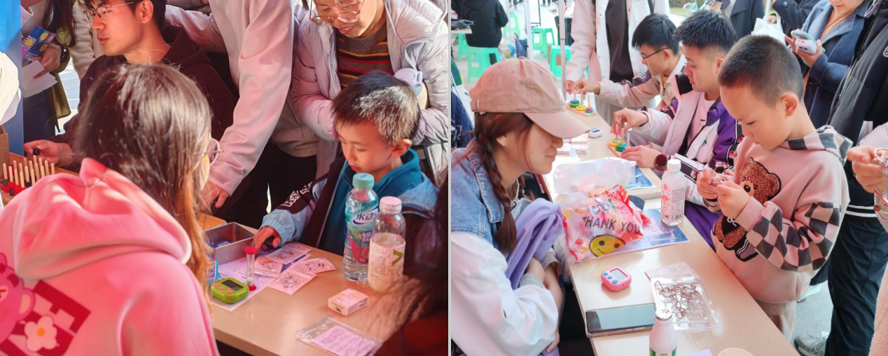 市集上,志愿者们认真细致地讲解游戏玩法和规则,热情引导和鼓励同学们参与挑战,并为挑战成功者颁发精美的奖品。趣味数学游戏激发了大家对于数学学科的兴趣,丰富多彩的互动体验更是让大家身临其境地感受到了数学的奇妙。