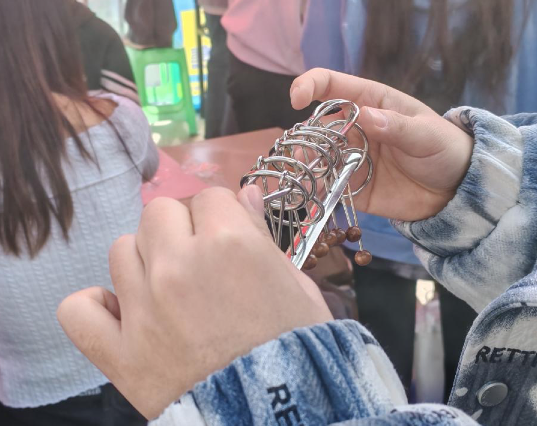 九连环的耐心考验:九个连环相互嵌套,一环扣一环,仿佛是一个古老的谜题,等待着你去解开。在市集上,参与同学与九连环进行着耐心与智慧的较量。每一次解环的喜悦,都是对你反复尝试与摸索的回馈。