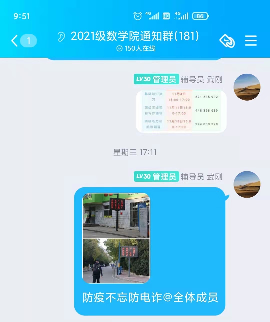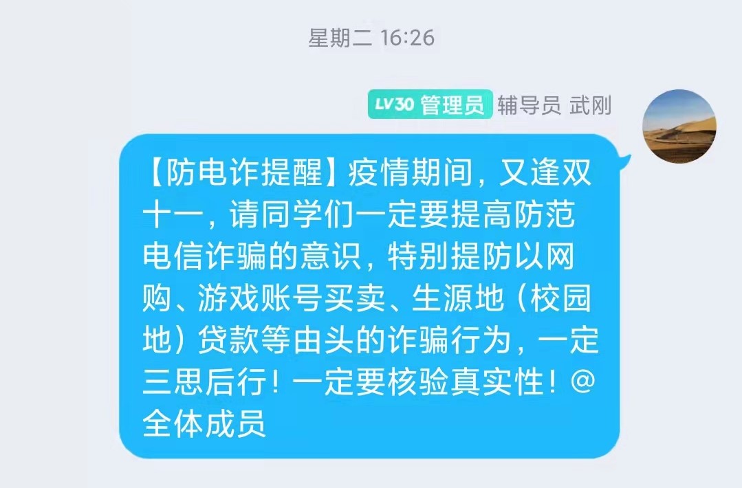学院通过主题班会、专题讲座等方式将宣传切实覆盖每个班级、每位学生。利用学院年级大会、微信公众号、学生QQ群等媒介发布推送有关防范电信诈骗以及识别和防范邪教知识相关内容,向同学们科普了防诈骗手段以及常见邪教形式等内容,希望同学们保持警惕,加强防范。通过学生QQ群方式将相关知识内容覆盖每个班级、每位学生,切实提升教育引导工作的覆盖面和吸引力。学院学工组老师通过走访学生宿舍的方式,在走访期间认真询问同学们近期学习生活状况、假期行程与活动,同时掌握每个学生的防电诈、反邪教相关情况,告诫同学们一定要严守学校各项纪律要求,并再次叮嘱同学们谨防电信诈骗,积极识别和防范邪教,保障自己的身心健康和财产安全。