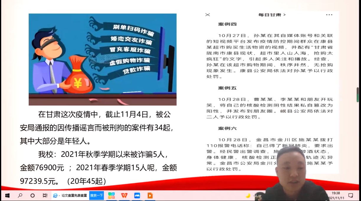 强化防诈骗知识宣传教育,开展防诈骗知识宣传活动,阐述不良网贷、电信诈骗等校园案例,鼓励同学们观看由榆中县反诈联席办和榆中县融媒体中心举办的“构建品质榆中 防范电诈你我同行”直播活动,教育和引导学生树立自觉抵制网络诈骗,切实提高学生防范电信网络诈骗意识。