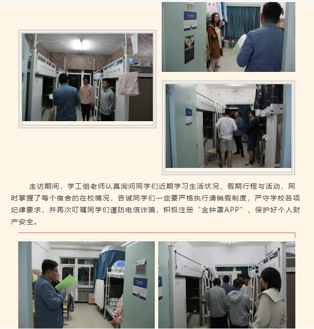 持续开展日常摸排,通过各班级生活委员、各宿舍宿舍长等精准掌握beat365官网学生涉及电信诈骗、邪教情况等信息,指导同学们通过理智有效的方式解决问题。积极配合地方政府、教育公安等管理部门,做好学院学生防电诈、反邪教监督管理和监测引导工作。